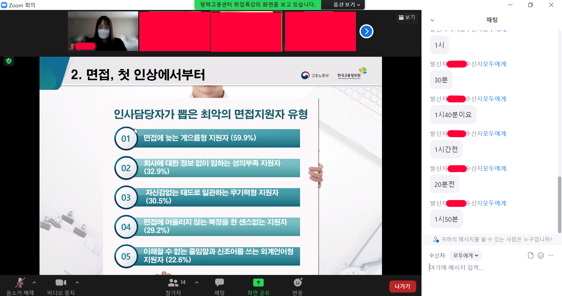 면접의 종류가 생각보다 많다는 것을 알게 되었습니다. 특히 AI 면접을 실제로 실시하고 있는 곳이 있다는 것도 이번에 처음 알게 되었습니다. AI 면접 기술을 이용하면 집에서 혼자 면접 연습을 하기 수월하겠다는 생각이 들었습니다. 저는 그동안 '면접'을 준비하려면 예상 질문에 대한 답변을 달달 외워가야하는 것이 아닌가하고 생각해왔었는데, '면접은 대화'라고 말씀해주신 것이 인상적이었습니다. 기계적으로 질문에 대한 답변을 출력하는 것이 아니라, 사람 대 사람으로서 대화하며 나를 알린다는 마인드를 갖춰야겠다고 생각하게 되었습니다.
