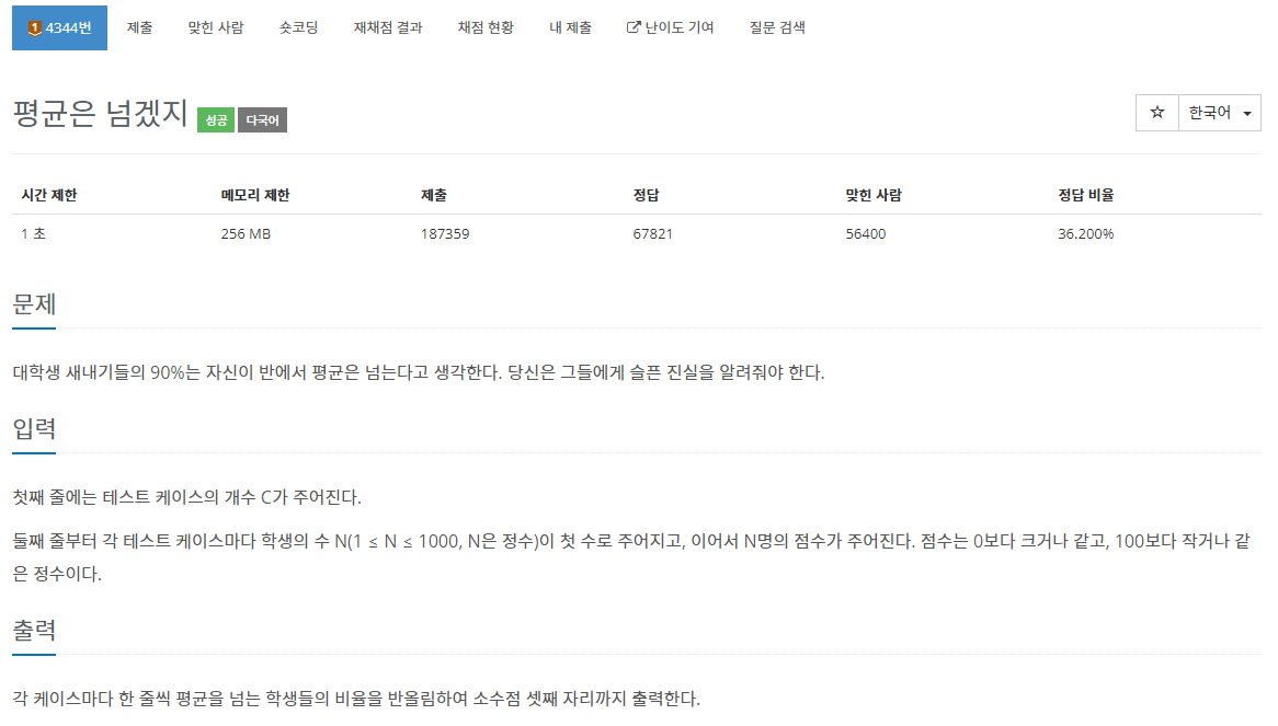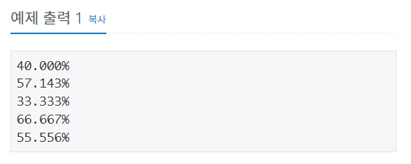 이 문제는 '소수점 셋째 자리까지' 라는 출력 형식이 있습니다. 보통 실수 40을 그냥 출력하게 되면 '40.0'이라고만 출력되지, '40.000'이라고 출력되지 않습니다. 소수점 둘째 자리, 셋째 자리에 있는 0은 생략되죠.