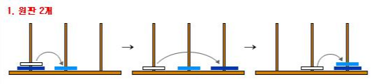 원판이 2개일 때를 살펴봅시다. 원판을 어떻게 움직여야 할까요?