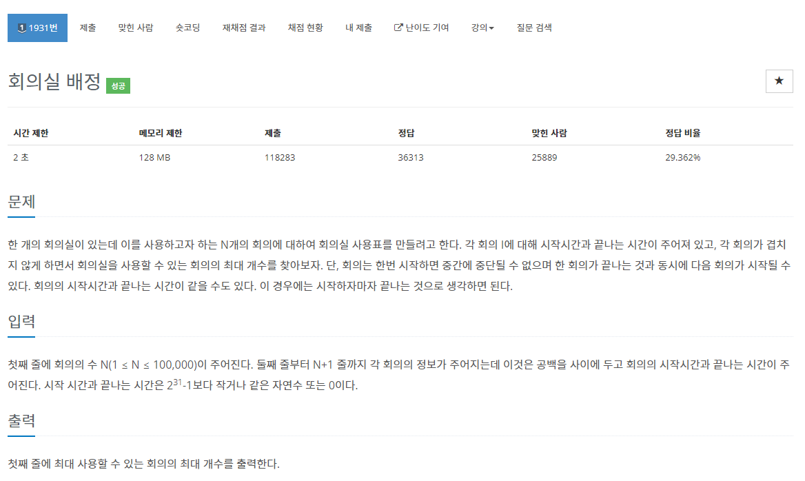 만일 종료 시간이 동일한 회의가 여러 개라면, 그 중 아무거나 골라도 됩니다.