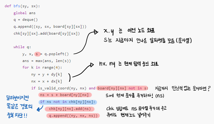 '좌표 경로'로는 중복이 걸러지지 않으므로, '알파벳 경로(ns)'를 생성해서 집합에 담아둠으로써 나중에 또 똑같은 알파벳 경로로 탐색을 할 수 없게끔 중복을 차단합니다.