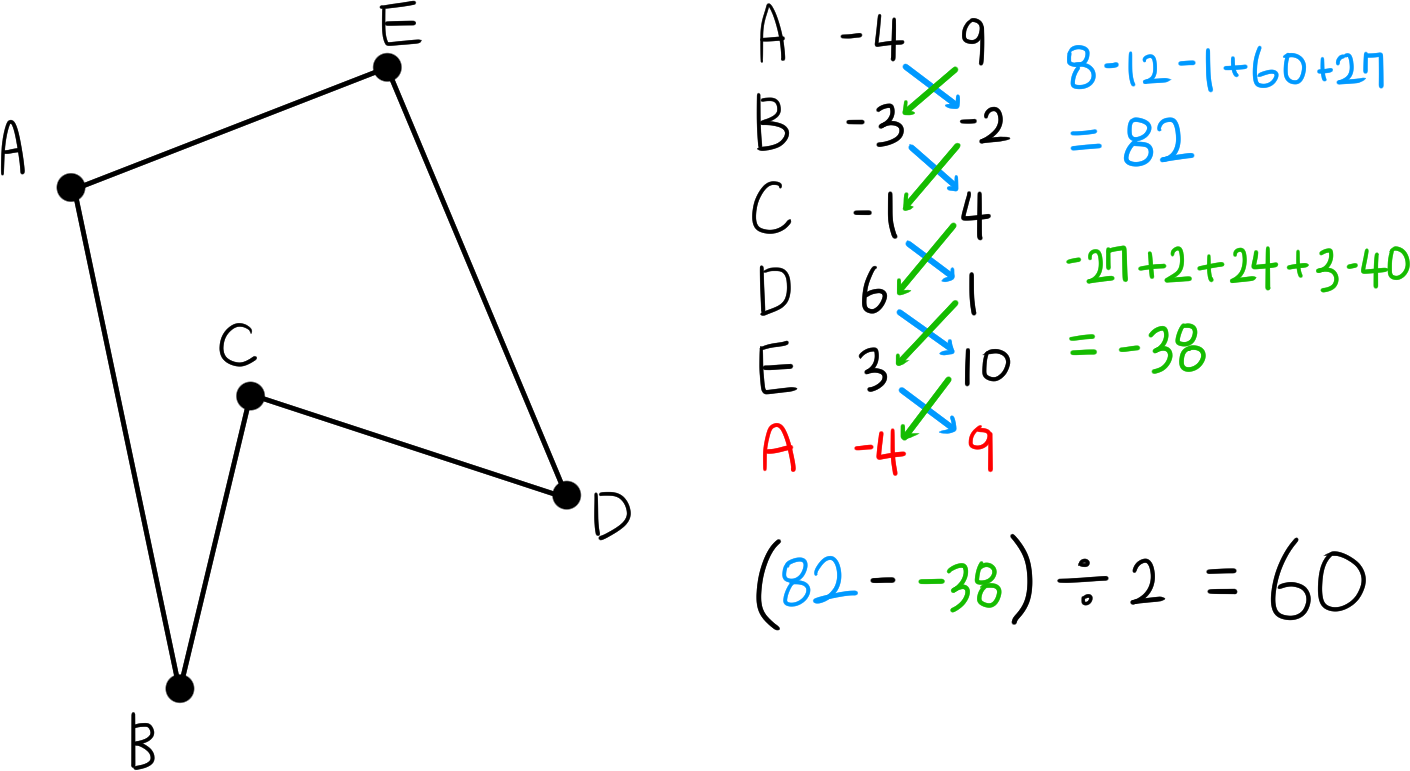다음 점 A(-4, 9), B(-3, -2), C(-1, 4), D(6, 1), E(3, 10)로 구성된 다각형의 넓이를 구해봅시다.