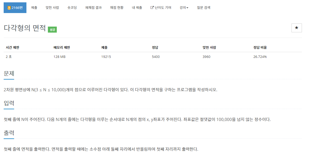 - 만일 좌표들을 시계 방향으로 나열하고 문제를 풀면 넓이가 음수로 나옵니다.