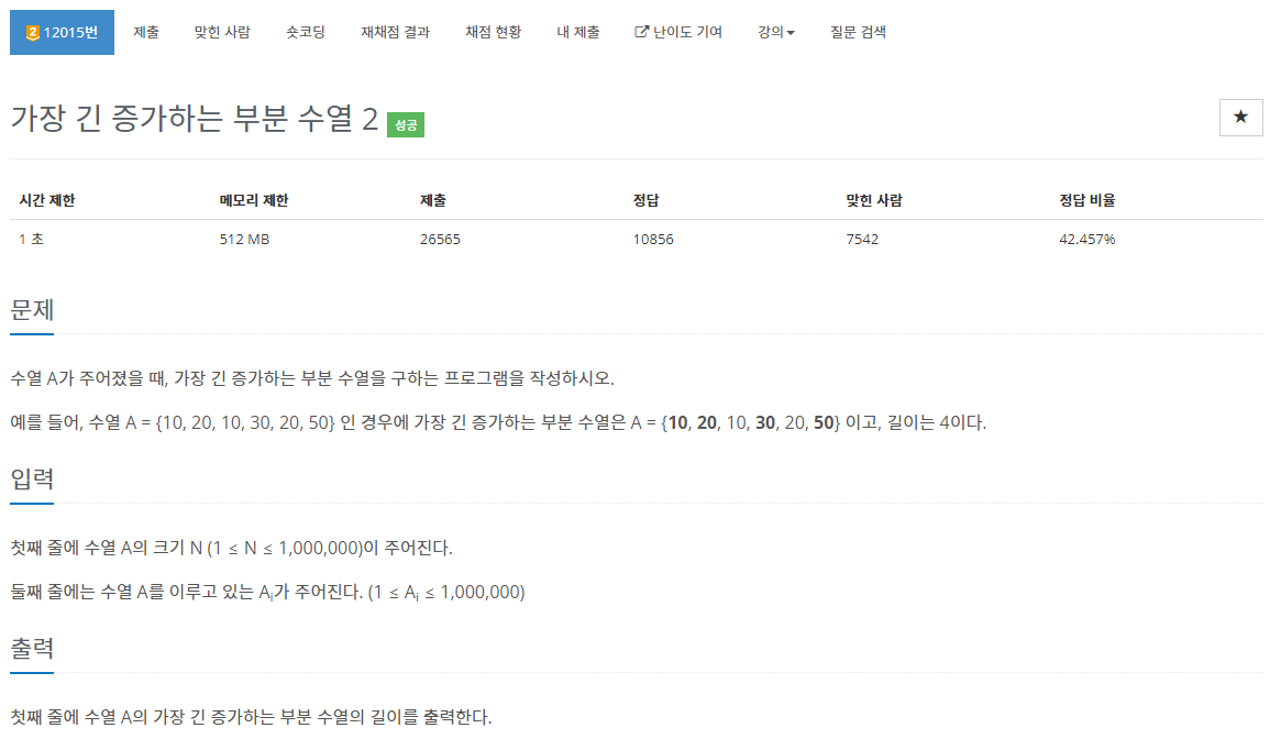 LIS 배열에는 Longest Increasing Subsequence, 즉 가장 긴 증가하는 부분 수열을 담을 것입니다. 일단 LIS 배열에 어떤 값들이 담길지 모르므로, 배열 A의 가장 첫 원소를 넣어줍니다.