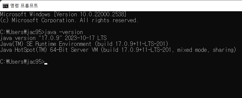 위 사진처럼 cmd 창에 "java -version"이라고 명령했을 때 17.xxx 라고 뜨면 17버전이 잘 까린 것이다.
