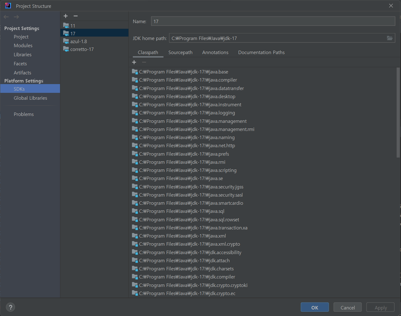 먼저 Project Structure에서 SDK를 jdk 17로 맞춰준다.