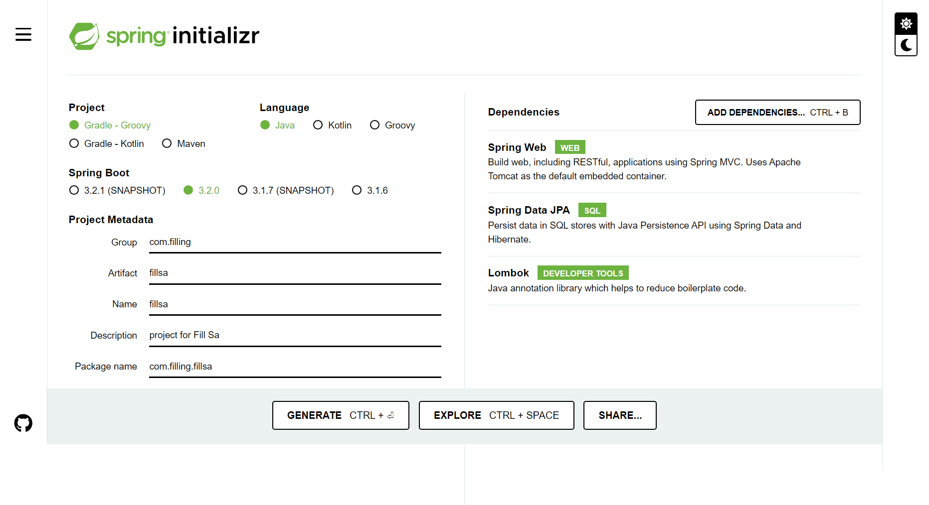 Dependencies는 우선 Spring Web, Spring Data JPA, Lombok만 추가하였다.