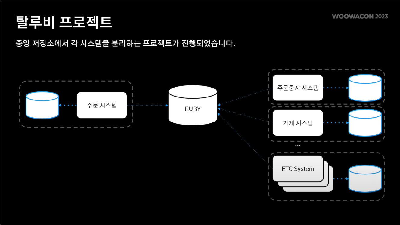 과거 배민은 중앙 집중 DB(Ruby)를 사용했었다. 따라서 여러 시스템들 중 하나에서 장애가 발생하면 이는 루비의 부하로 이어졌고, 결과적으로 중앙 DB를 바라보는 다른 모든 시스템에서 장애가 발생하는 문제점이 있었다.