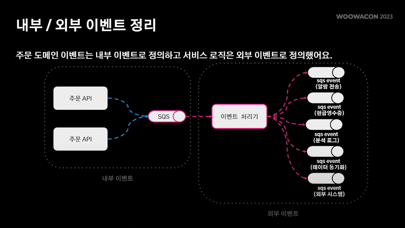주문 라이프사이클에서 처리되는 도메인 로직들은 sqs를 태우고, sqs를 구독하는 이벤트 처리기가 도메인 이벤트를 수신해서 외부 이벤트를 발행하는 구조로 설계하였다.