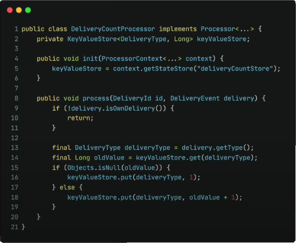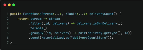 - 스트림 프로세서는 '배달'이라는 토픽을 스트림으로 input 받는다.