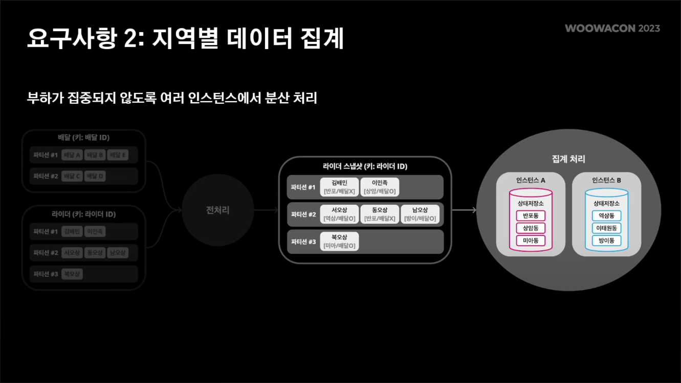 행정동 단위로 그룹핑을 하고 카운팅과 같은 집계 연산을 수행할 수 있다. 연산 결과는 역시 행정동 단위로 상태 저장소에 저장될 것이며, 이 데이터는 분산 저장된다.