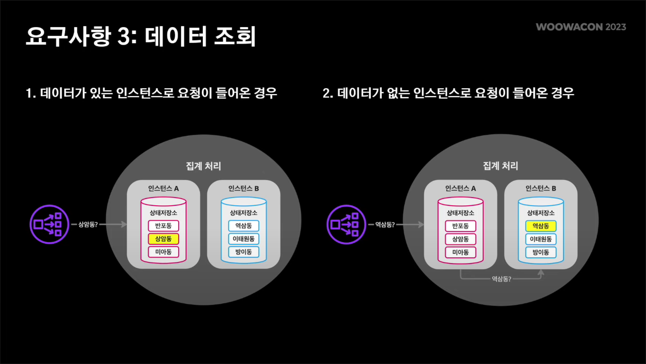 데이터 조회 요청은 로드밸런서를 타고 들어온다. 만일 1.데이터가 있는 인스턴스로 요청이 들어온 경우, 해당 인스턴스에서 상태저장소를 조회해서 결과를 직접 제공할 수 있다.