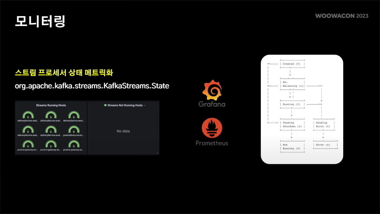 스프링 카프카는 이에 대한 인터페이스를 제공한다. 프로메테우스를 통해 주기적으로 이를 수집하고 그라파나로 이를 노출해서 알림을 받고 있다. 이를 통해 우리는 에러나 리밸런싱 상태에 빠진 스트림 프로세서를 인지할 수 있다.