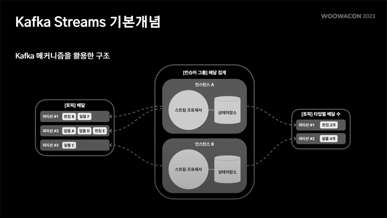 어떤 하나의 인스턴스에서 데이터가 처리되면 부하가 집중되기 때문에, 여러 인스턴스에서 분산돼서 처리시켜야한다. 카프카 스트림즈를 사용하면 분산 처리를 할 수 있다.