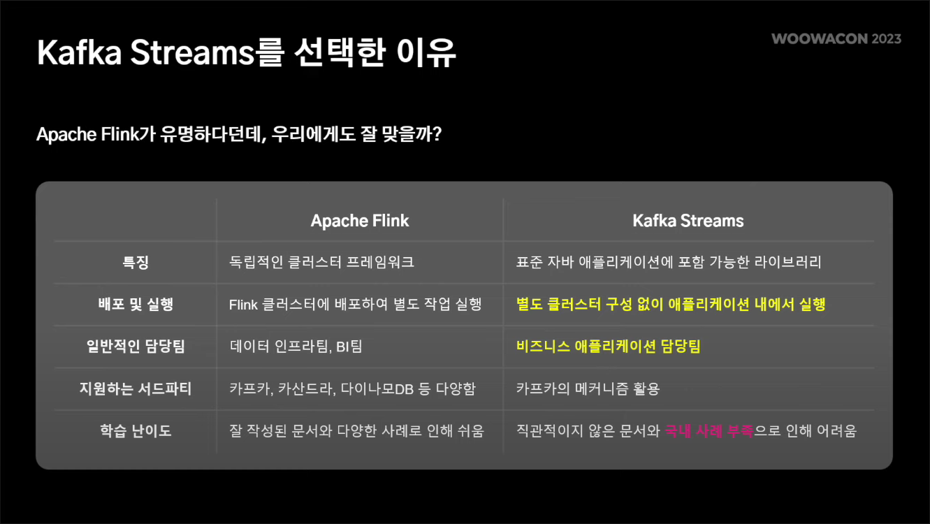 Kafka Streams는 지원하는 서드파티가 Kafka 밖에 없고, 국내 사례가 부족하다는 단점이 있었지만, 별도 클러스터 구성이 필요 없다는 장점이 있어 선택하게 되었다.