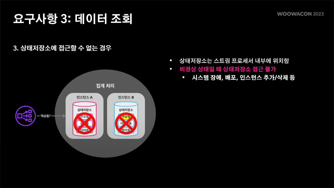 상태저장소는 논리적으로 스트림 프로세서 내부에 위치하게 된다. 그렇기 때문에 스트림 프로세서가 정상이 아닌 경우에는 상태 저장소에 접근할 수 없다. 시스템 장애 뿐만 아니라 시스템을 배포하는 순간이라던지, 스케일 인/아웃이 이루어지는 시점이 상태저장소에 접근할 수 없는 시점이다.