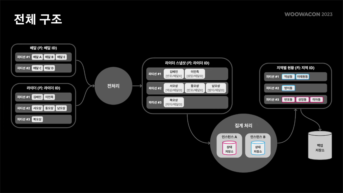 - 배민 서비스에서 배달과 라이더의 현황을 집계하기 위해 뒷단에서 어떤 일들이 실시간으로 이뤄지고 있는지 알 수 있었다.