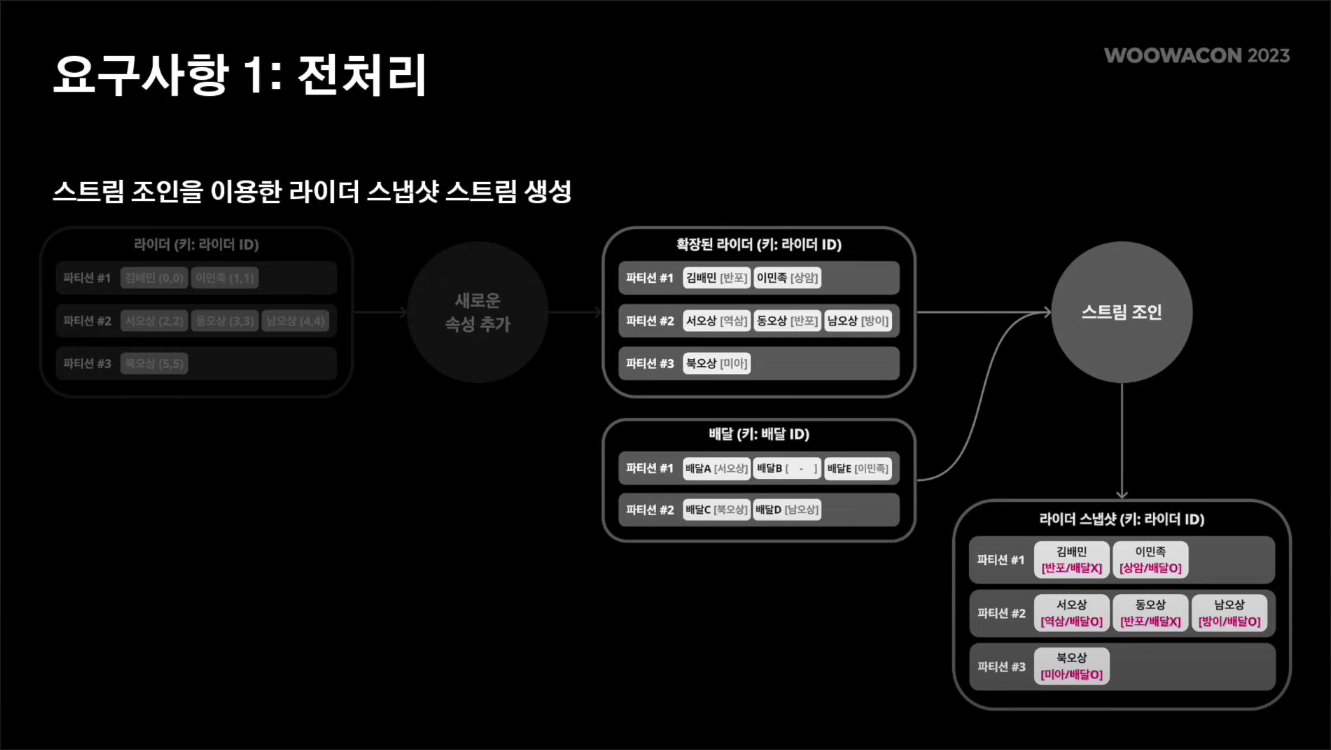 이렇게 발행한 확장된 라이더 스트림과 배달 스트림을 적절히 조인 함으로써 라이더 스냅샷 스트림을 만들수 있다.