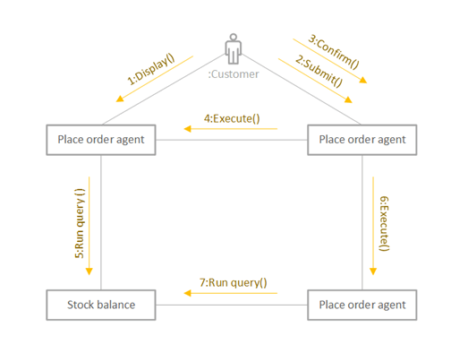 커뮤니케이션 다이어그램이란 객체들이 상호작용하는 과정과 객체들 간의 연관을 그림으로 표현한 것입니다. 클래스 다이어그램에서 관계가 제대로 표현됐는지 점검하는 용도로도 사용되며, 초기에는 협업(Collaboration) 다이어그램이라고 불렸습니다. 커뮤니케이션 다이어그램은 아래와 같이 생겼습니다.