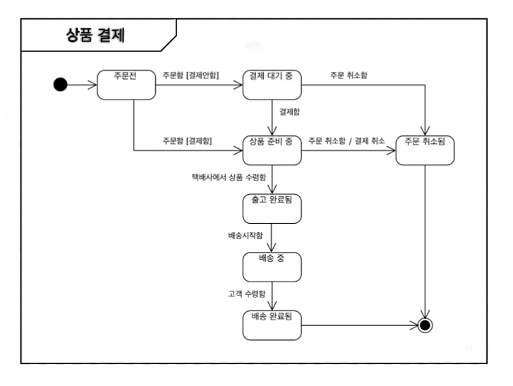 상태 다이어그램이란 이벤트에 의한 객체들의 상태 변화를 그림으로 표현한 것입니다. 객체의 상태란 객체가 갖는 속성 값의 변화를 의미하며, 시스템에서 상태 변환 이벤트를 확인할 필요가 있는 객체만을 대상으로 그립니다. 상태 다이어그램은 다음과 같이 생겼습니다.